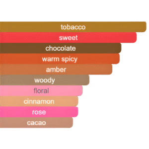 عطر غامض وجذاب، تمتزج فيه قوة الشوكولاتة الداكنة مع عمق خشب الأرز. يضيف القلب الدافئ من القرفة والليلك لمسة راقية، بينما تمنح القاعدة من التبغ والعنبر والورد أثراً عميقاً، حسيّاً ولا يُقاوَم