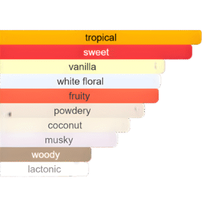 Un parfum ensoleillé et exotique qui évoque une escapade tropicale. L’alliance de la mangue juteuse et du fruit de la passion apporte une fraîcheur sucrée irrésistible, tandis que le jasmin et la fleur d’oranger ajoutent une élégance florale. En fond, la vanille et le musc se mêlent au cashmeran pour une touche sensuelle et réconfortante.